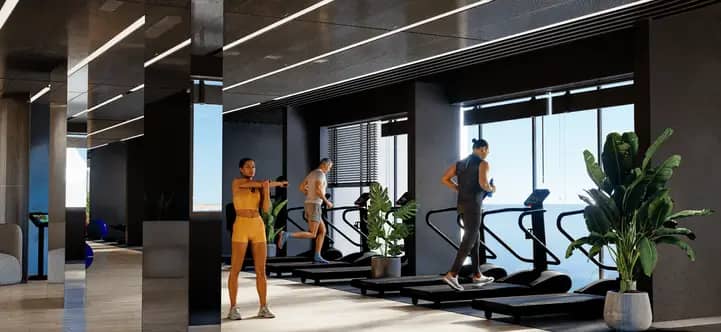 Тренажерный зал расположен на верхнем этаже, где открывается вид на морской горизонт. Спортивное оборудование высокого качества. В зоне отдыха установлены кресла и диваны.
