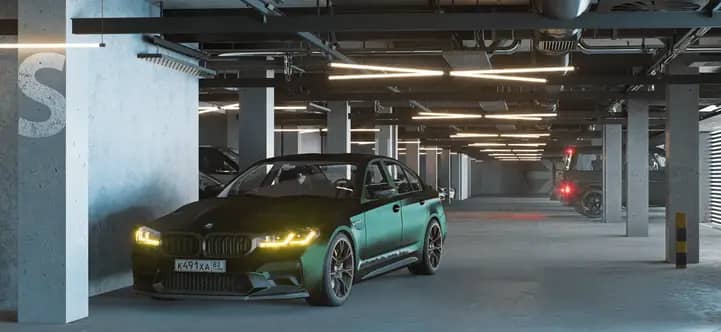 Двухуровневый крытый паркинг на 94 места и гостевая стоянка на 24 места