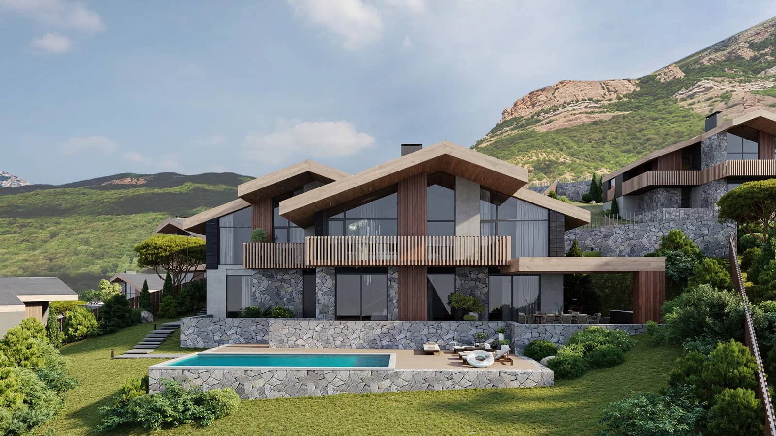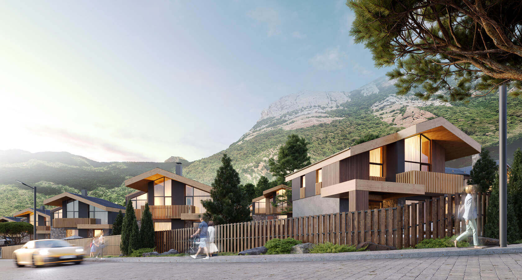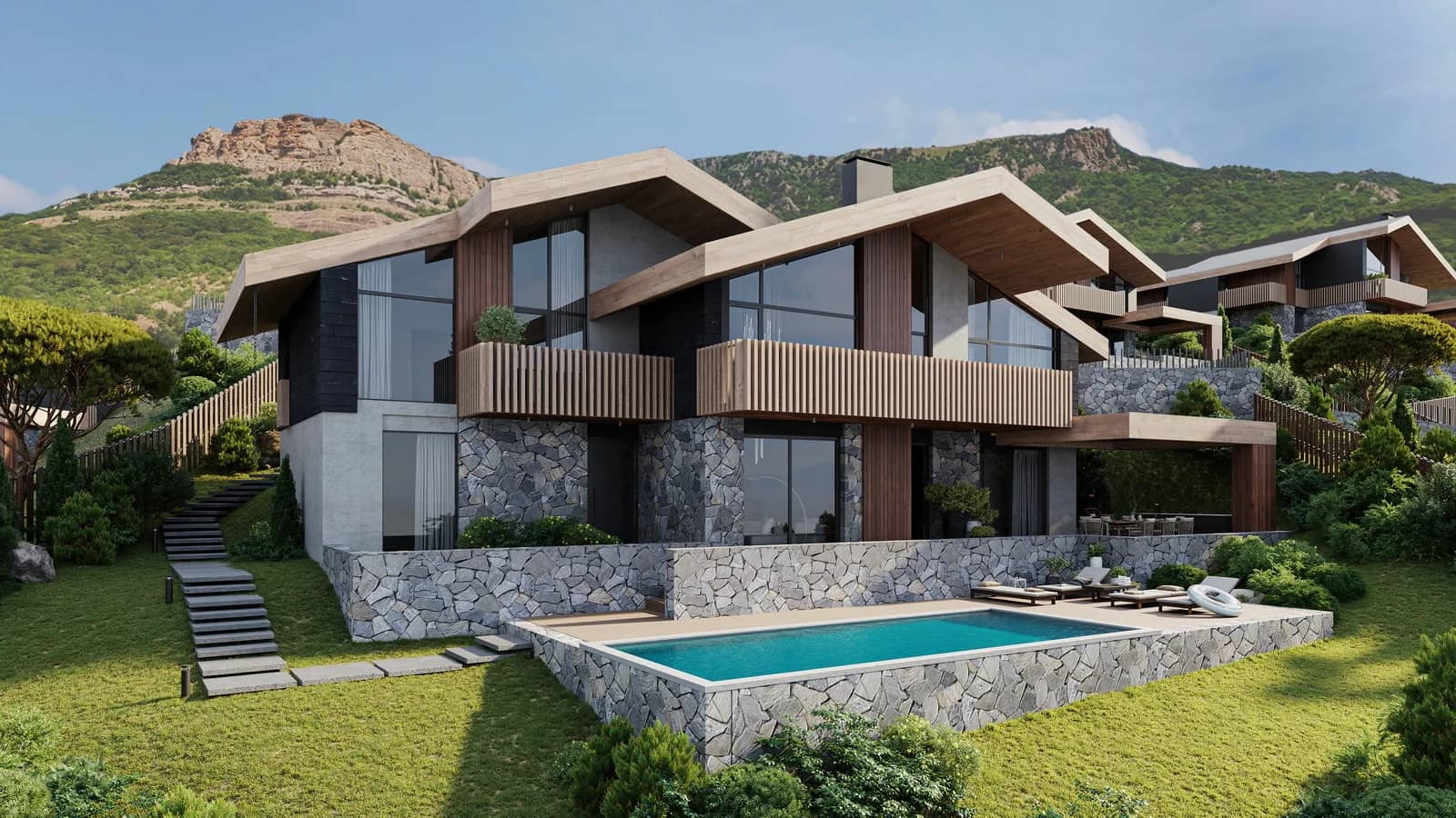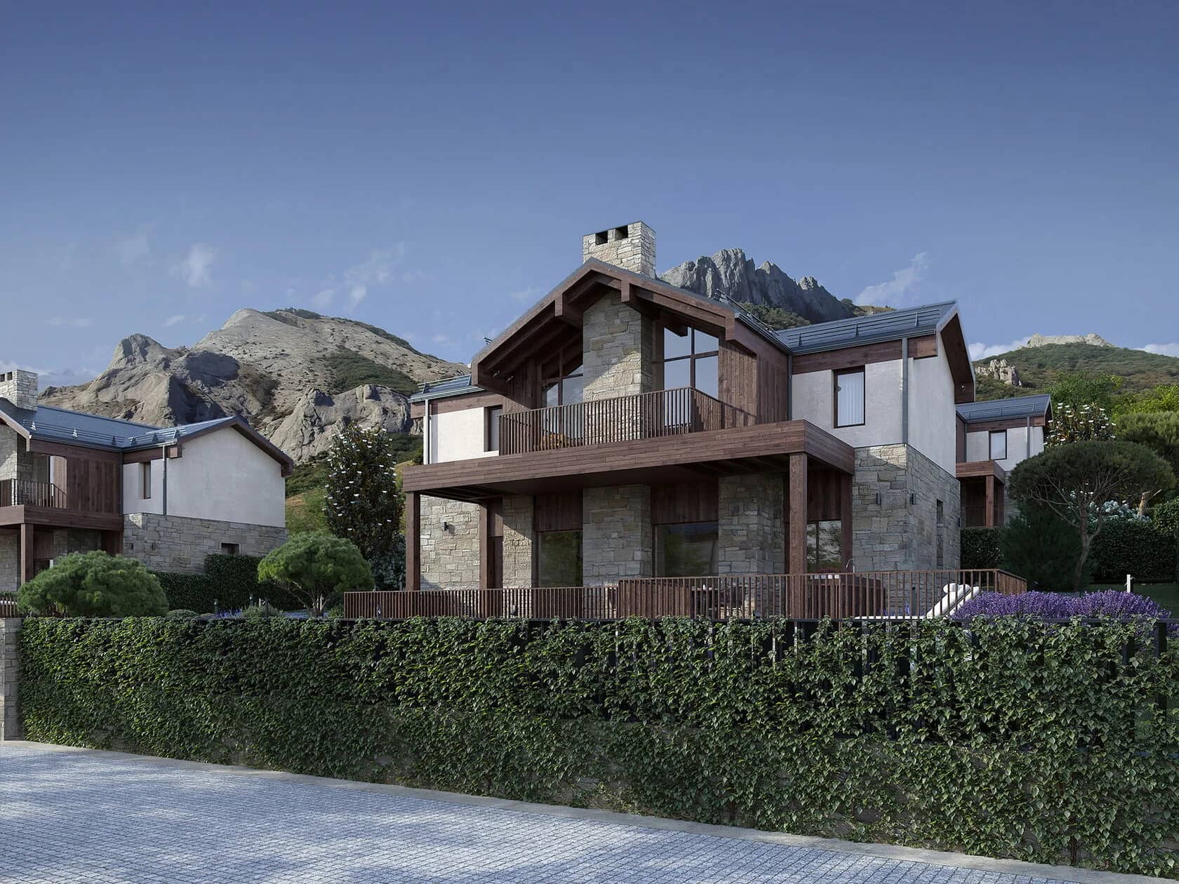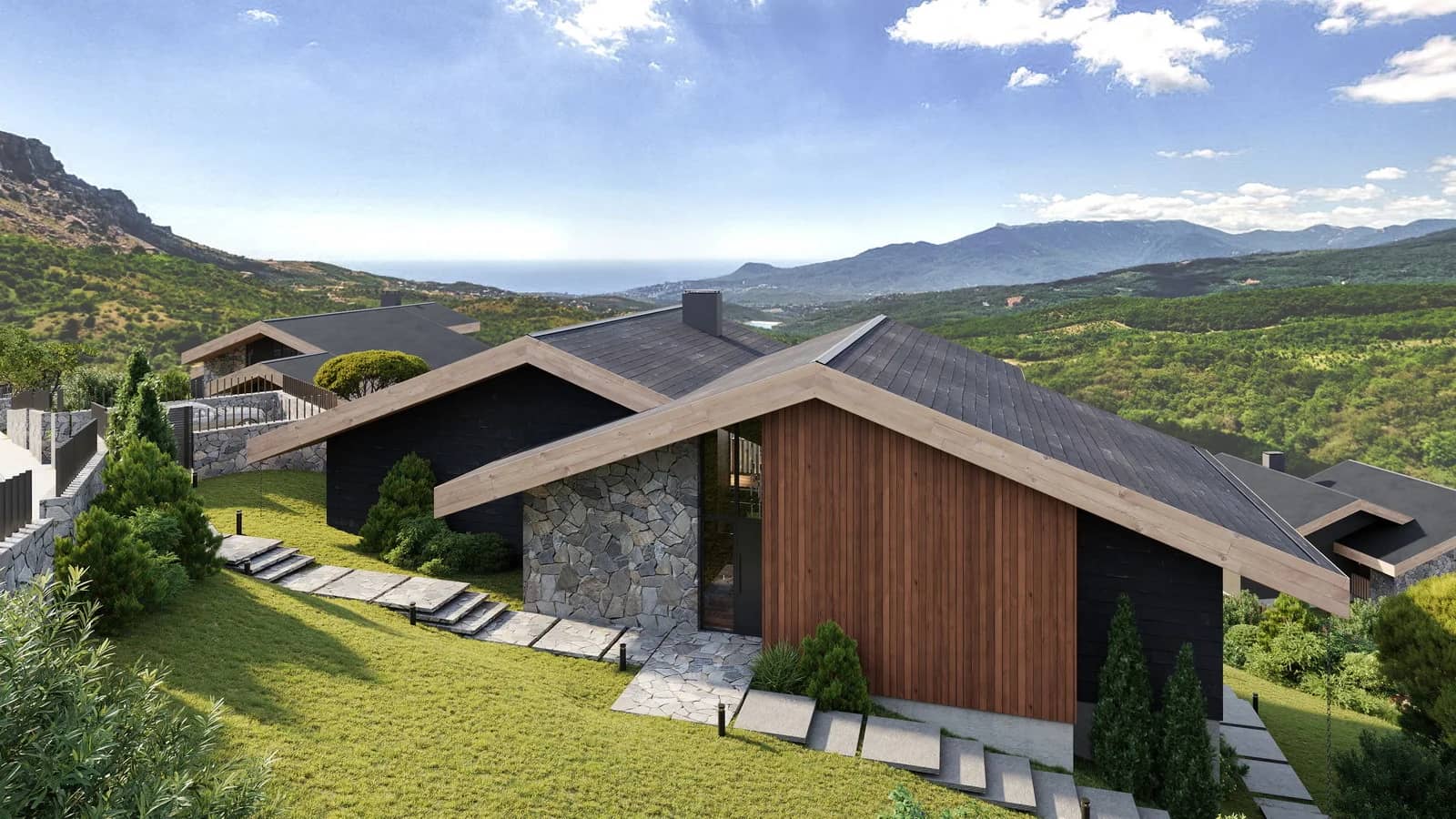 Виллы и коттеджи с архитектурой в стиле «шале» у подножия горы Демерджи с видом на море