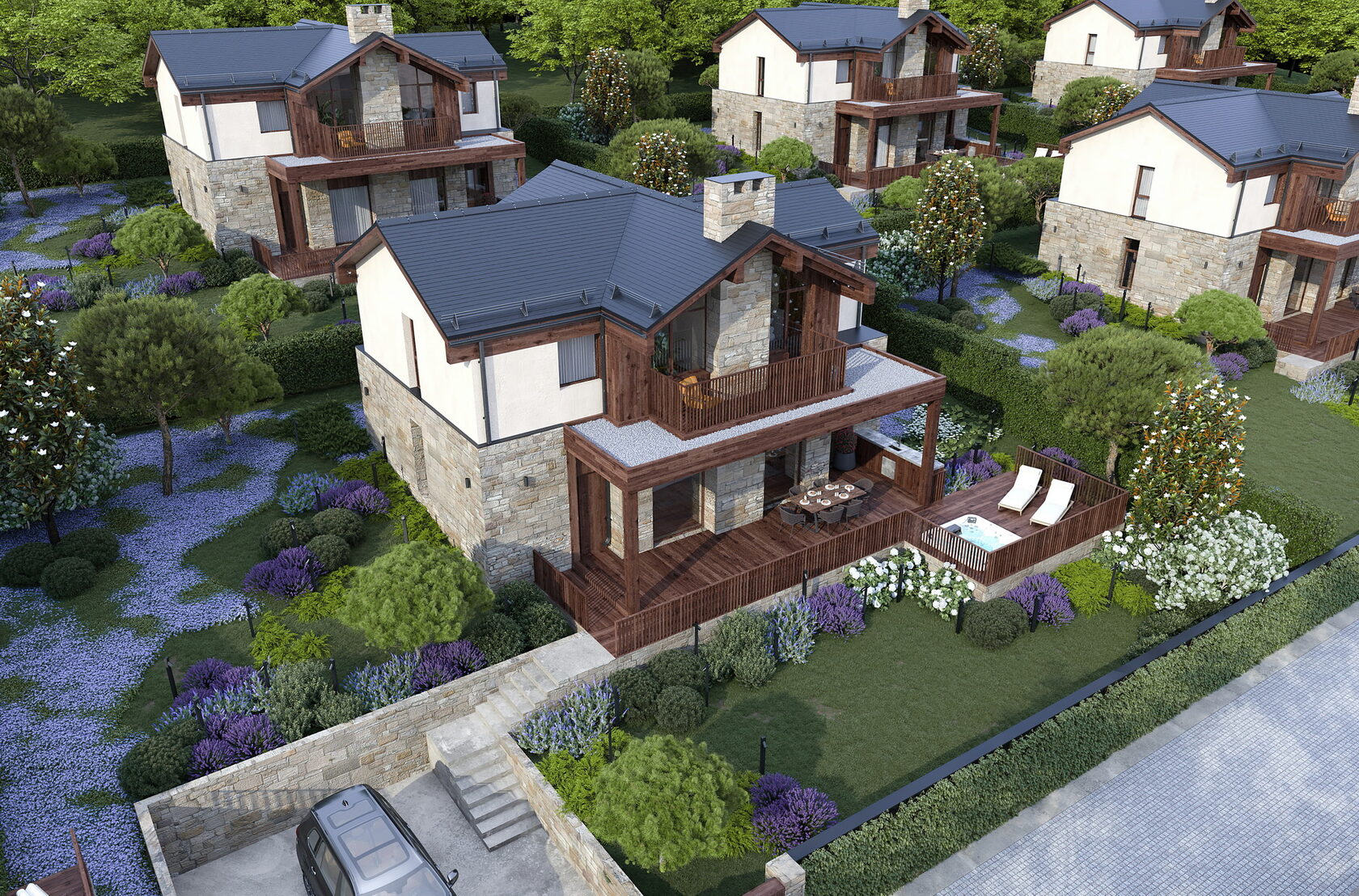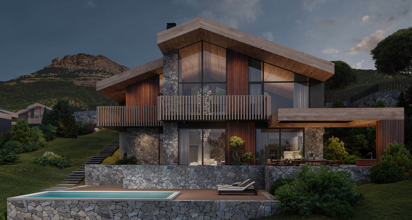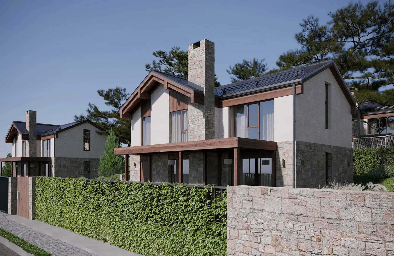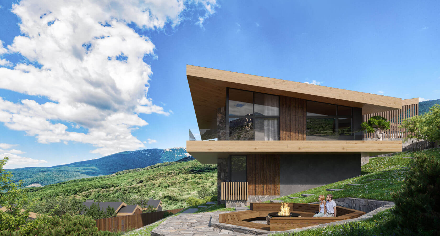 Виллы и коттеджи с архитектурой в стиле «шале» у подножия горы Демерджи с видом на море