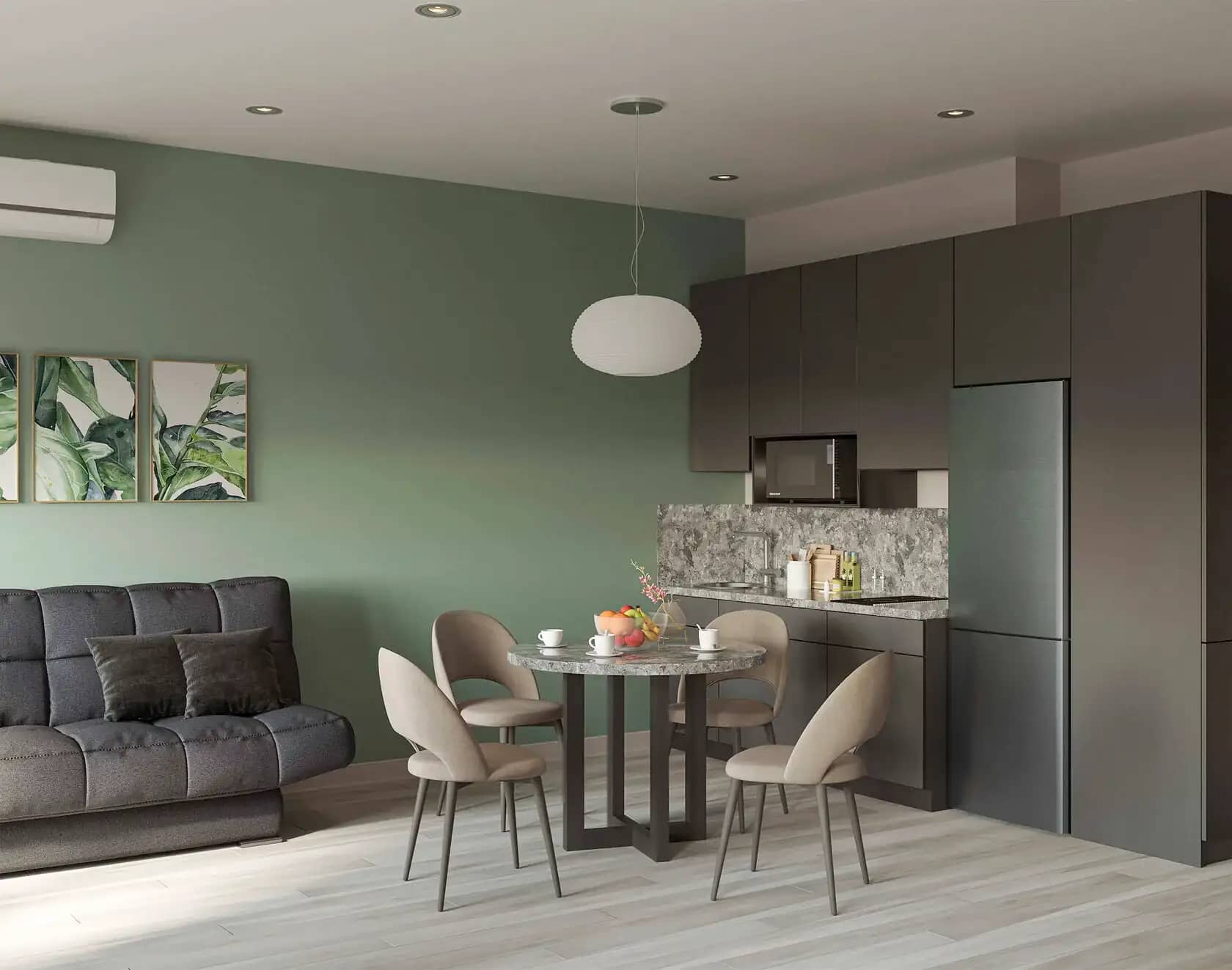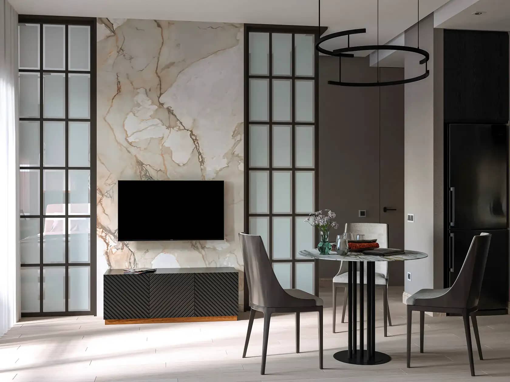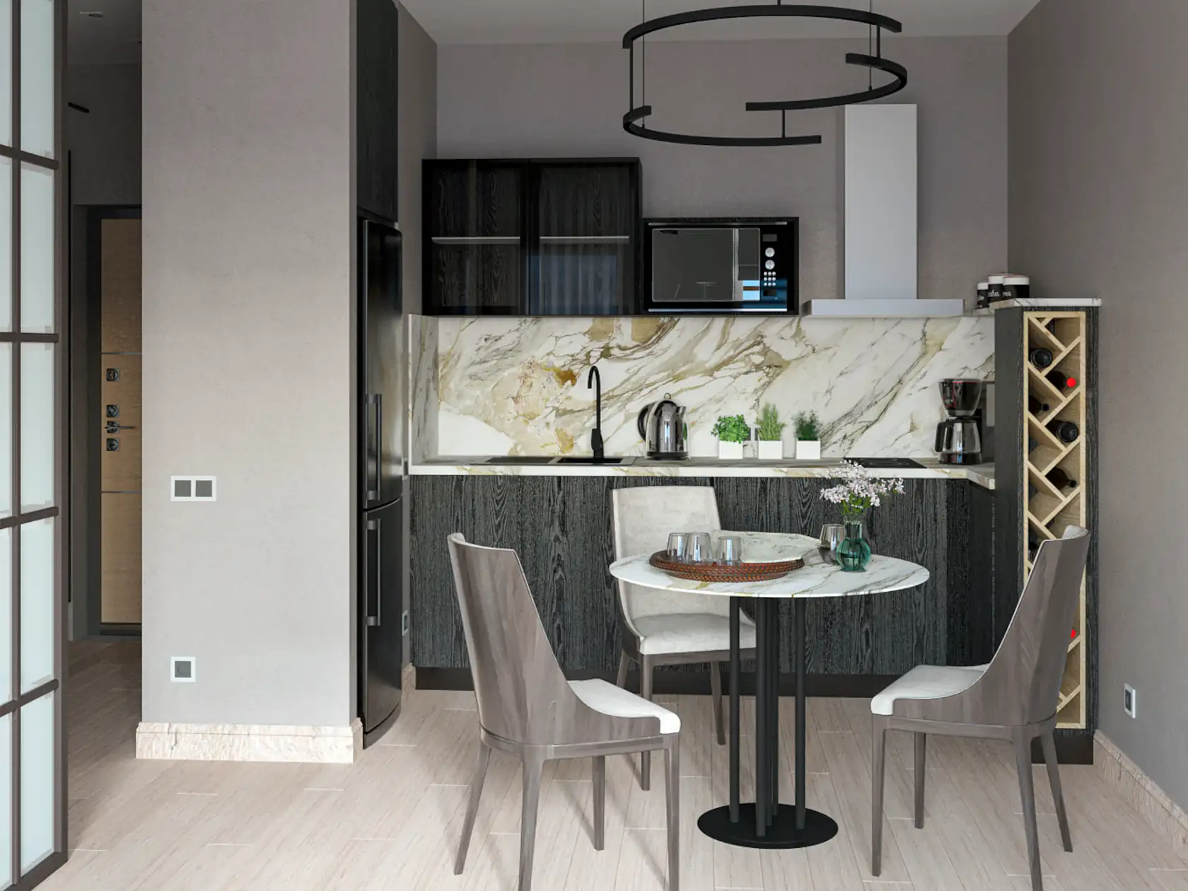 - Кухня: фартук и пол – плитка Кеrаmа Marazzi Дайсен (серый светлый обрезной 600×600 мм), фасады МДФ пленочные фабричные с фрезерованной ручкой Integra, корпус ЛДСП (однотонные серый), кухонная мойка – керамогранитная;