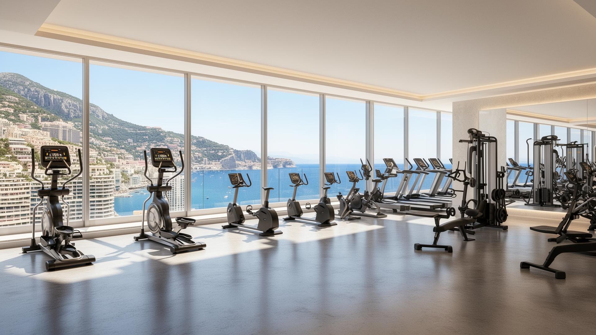 Современный тренажёрный зал с панорамными окнами от пола до потолка. Тренируйтесь, наблюдая за восходом солнца над морем. Оборудование премиум-класса и персональные тренеры..