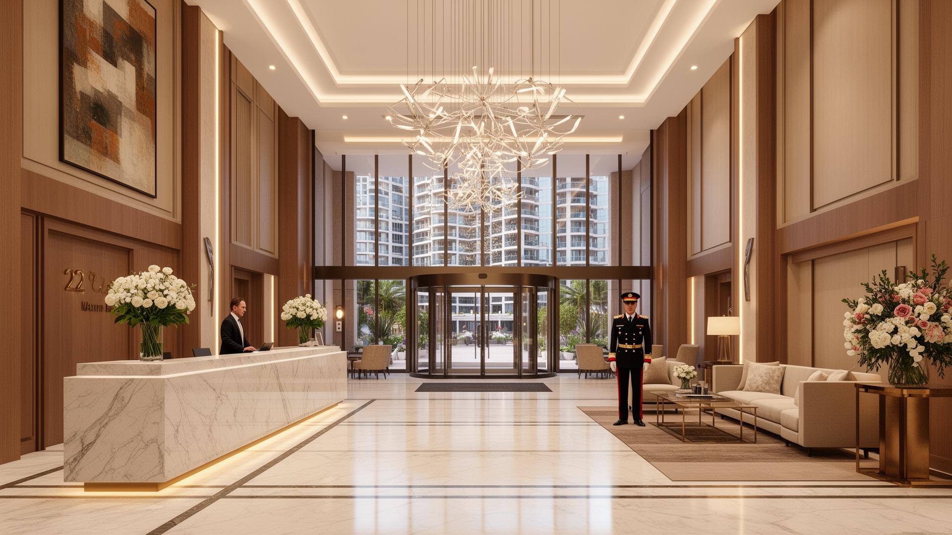 - Мраморное лобби с зоной ожидания и панорамным видом